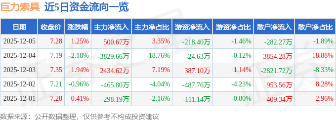 证券之星音讯,到2025年12月5日收盘,巨力索具(002342)报收于7.28元,上涨1.25%,换手率2.17%,成交量20.69万手,成交额1.49亿元。